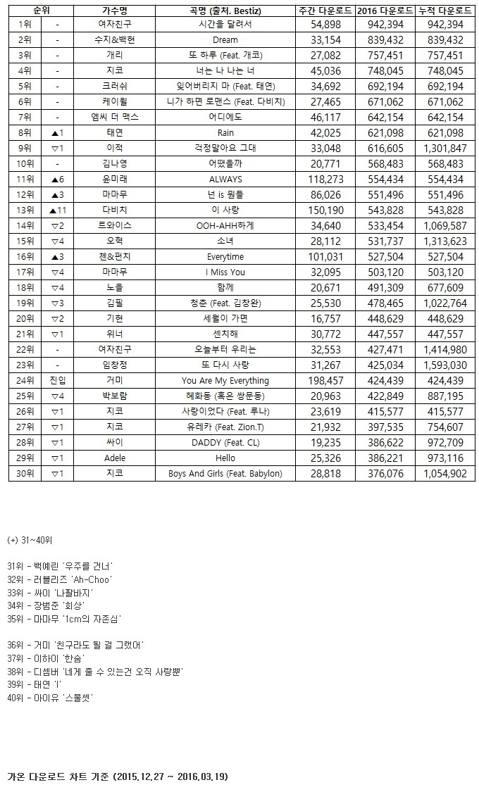 가온 2016년 음원 다운로드 순위 페이지 정보 작성자 Chonam 작성일16-01-30 08:50 조회4,902회 댓글0건 이전글 다음글 목록 본문 등록된 댓글이 없습니다. 이전글 다음글 목록